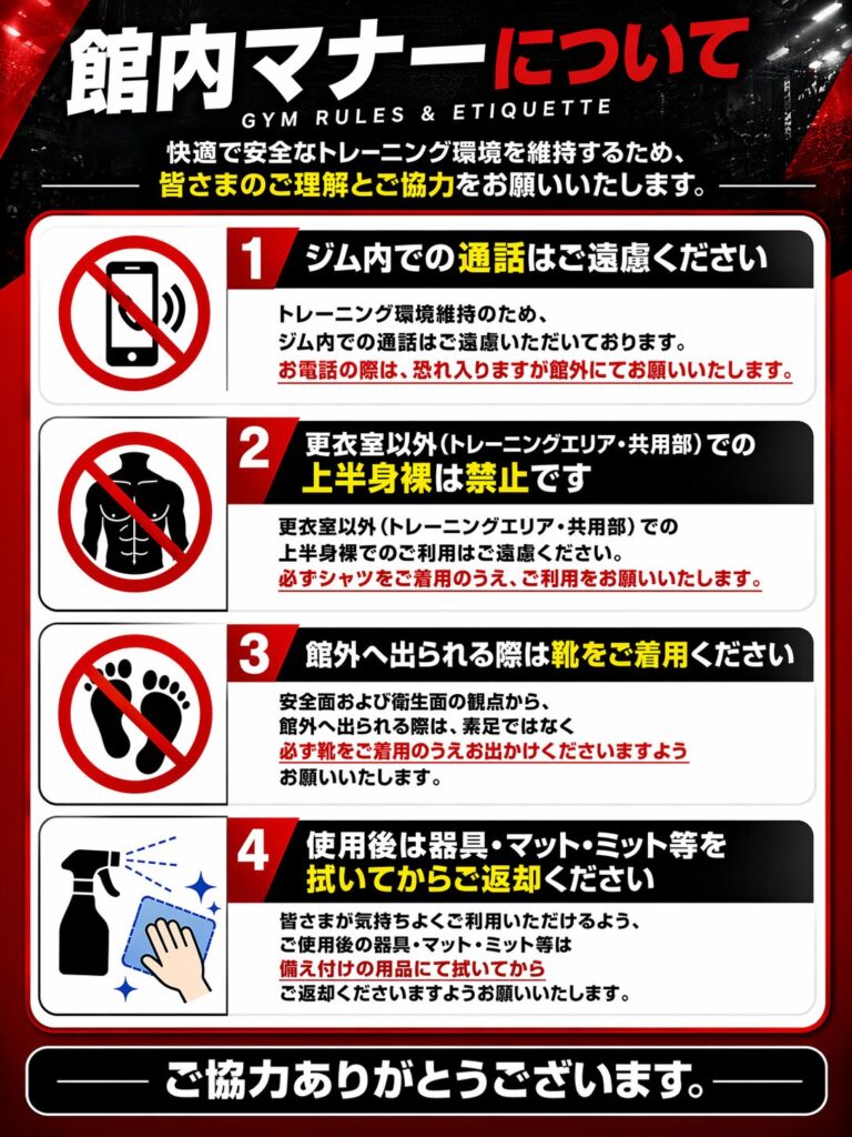 ・更衣室以外(トレーニングエリア・共用部)での上半身裸は禁止です。