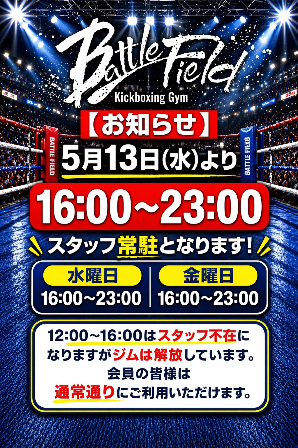 5月13日(水)より、水曜日・金曜日のスタッフ常駐時間が16:00〜23:00となります。
